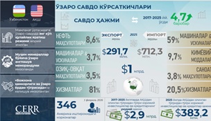 2026-02-19 35Президент Узбекистана Шавкат Мирзиёев по приглашению Президента США Дональда Трампа 17-19 февраля т. г. совершит рабочий визит в г. Вашингтон для участия в инаугурационном заседании Совета мира. ЦЭИР подготовил инфографику показателей торгово-экономического и инвестиционного сотрудничества Узбекистана с США за 9 лет.